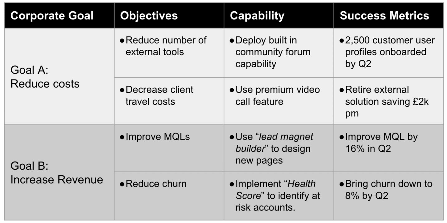 Goals and Objectives are clear, but let me explain the Platform Capabilities. Here is where you map the features and functions in your platform that can solve the objective. For example, if a customer goal is to "disseminate our performance data quickly and easily to the wider team", you would use the Dashboard functionality in your platform. The customer should have a Success Metric attached to that. For instance, "Reduce the time we spend on reporting by 60% by Q2."